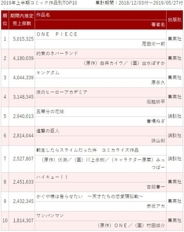 만화요일 2019 상반기 일본 만화책 판매순위 Top 10 2019년도 어느덧 Facebook